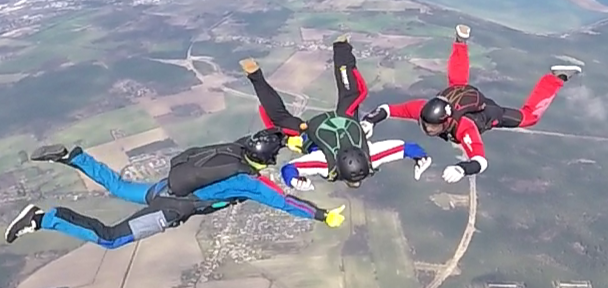 Fertig eingekleidet (Sprungkombi, Helm, Brille, Höhenmesser & ein speziell für die Ausbildung geeignetes Fallschirmsystem) geht es mit 2 erfahrenen und speziell für diese Art der Ausbildung qualifizierten Ausbildern auf rund 4.000 m Höhe. Es erfolgt der Ausstieg zusammen mit den beiden Ausbildern, während der ca. 50 Sekunden langen Freifallphase begleiten beide Ausbilder, mit dem Schüler verbunden, ein kleines "Programm" wird absolviert. Der Schüler wird dann in 1700 Metern Höhe seinen Hauptschirm selbstständig aktivieren und bis zur Landung durch einen am Boden wartenden Ausbilder mittels Funks begleitet.