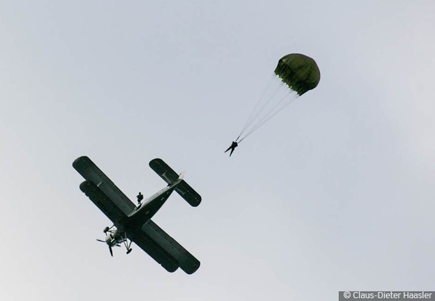 Die "klassische" Fallschirmspringer-Ausbildung, bei der die ersten Sprünge an einer mit dem Absetzflugzeug verbundenen Aufziehleine erfolgen.